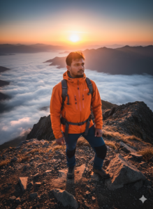 ✅ Nano Banana Prompt: Generate a breathtaking mountain portrait, ensuring the face in the final image is an exact match to the provided source image. The subject is standing on a rugged mountain peak at sunrise, with a vast, mist-filled valley stretching out behind him. He is dressed in technical hiking gear, looking out towards the horizon with a determined yet awe-struck expression. The rising sun casts long, dramatic shadows and bathes the scene in warm, golden light, creating a strong rim light around his silhouette. The details of his wind-swept hair and the texture of his gear should be exceptionally clear. Ultra-wide shot to capture the expansive landscape, 8K resolution, cinematic color grading.