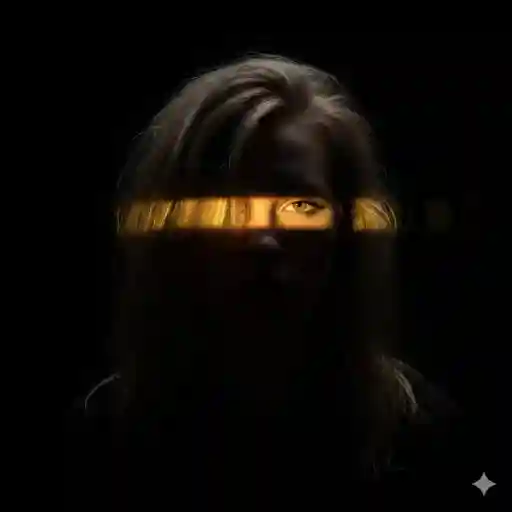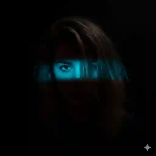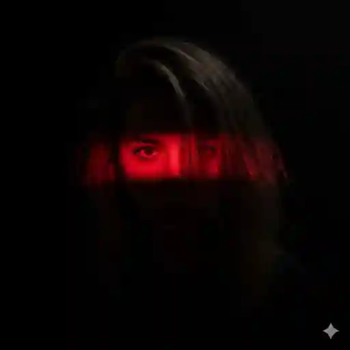 8k Ultra-realistic Dramatic studio portrait of a young woman messy dirty blonde hair over the eye (from uploaded image), centered, facing the camera with an intense stare. High-contrast, cinematic lighting wide angle. A single, intense horizontal band of vivid red light illuminates only the eyes and a lil bit in the bridge of the nose; the rest of the subject and hair are plunged into deep, pure shadow/silhouette